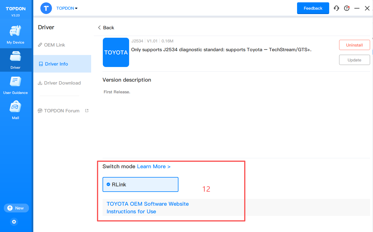 4. Click Driver > Driver Info. Then click TOYOTA to check the driver mode.