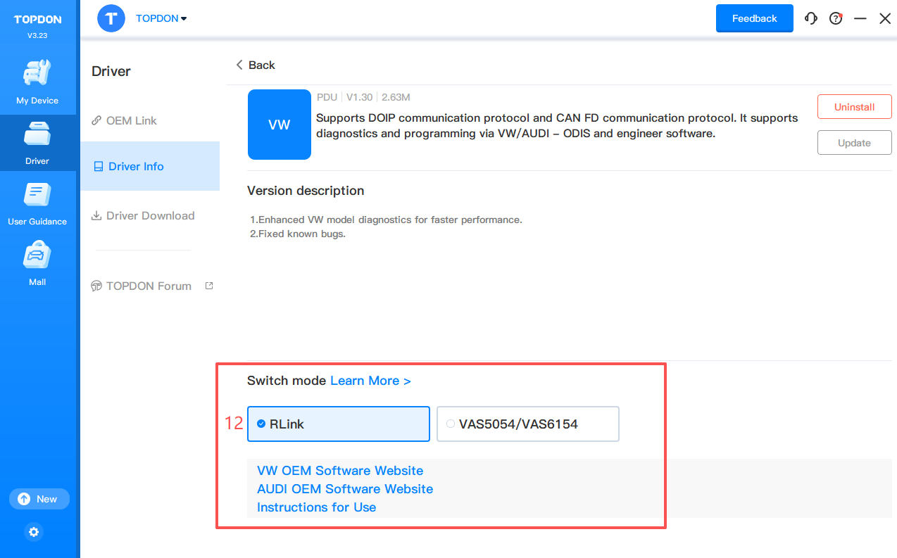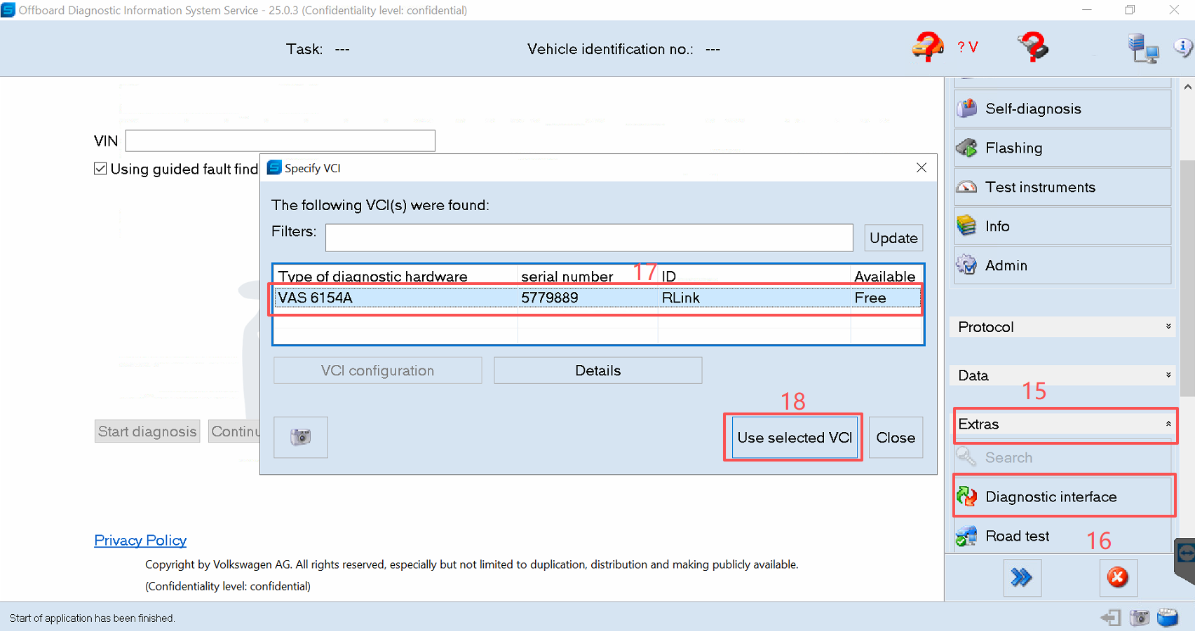 To use the original 6154/5054 device for diagnostics, select VAS5054/VAS6154 mode (restore the original driver mode).