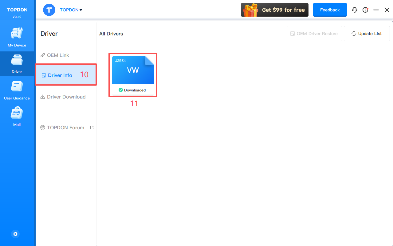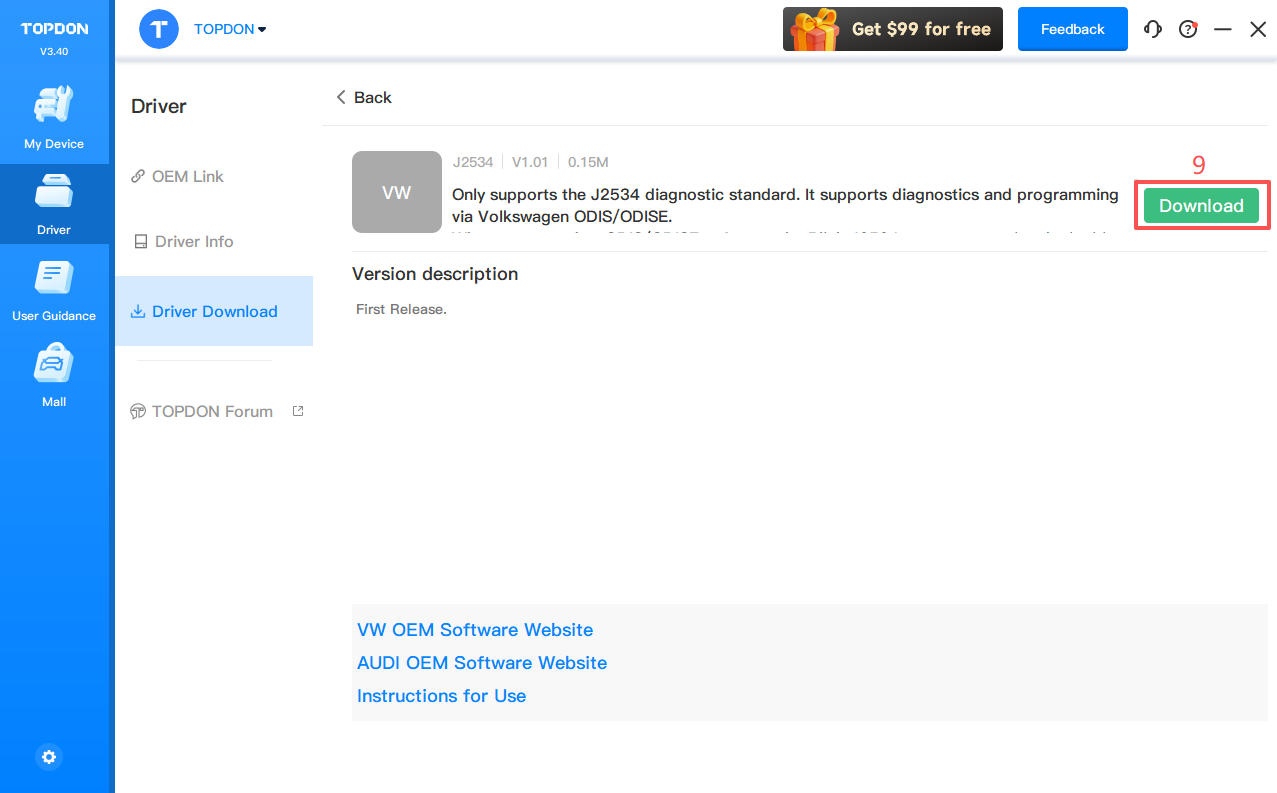 3. Click Driver > Driver Download. Click VW and click Download to download the driver. Note: Download the corresponding driver according to the OEM software. Do not download drivers that are not related to the OEM software.